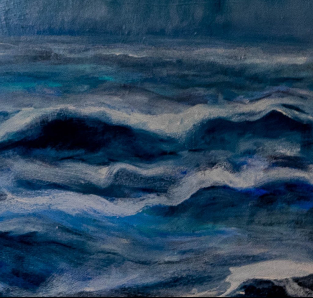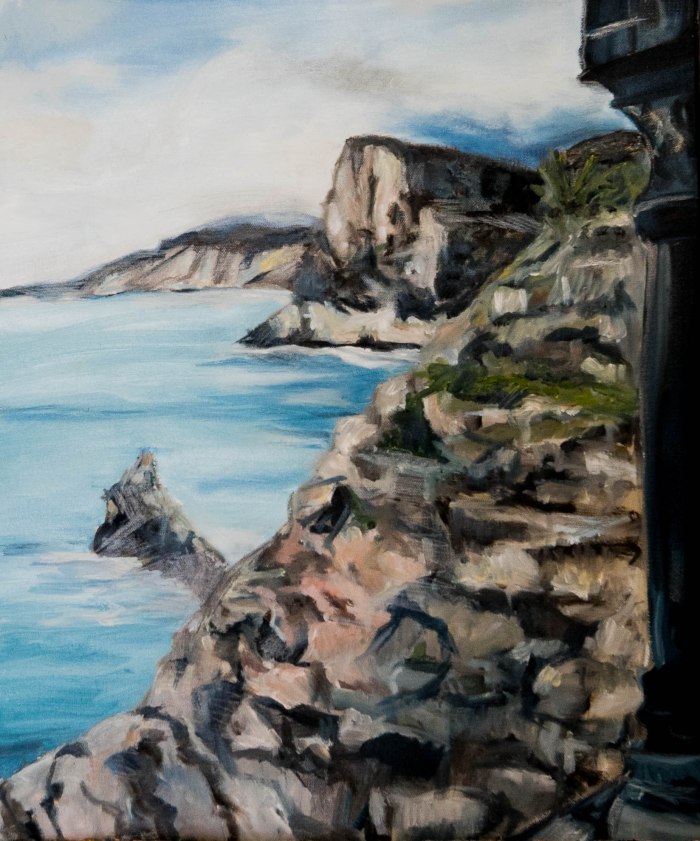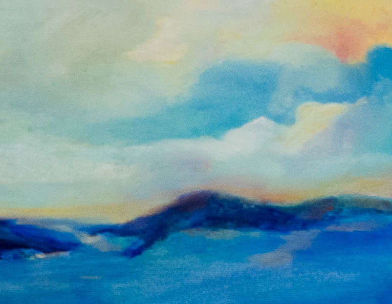 Il mare era ciò che vedevo dalla mia finestra, si apriva davanti a me il Golfo dei Poeti. Le immagini sono evocative, hanno il richiamo della nostalgia, con i colori delle stagioni, i movimenti impercettibili o tempesta quando il libeccio soffia e scaglia con forza onde contro gli scogli. Solo perdendo qualcosa che si è amato, ci si rende conto della sua bellezza, ormai lontana. In un’altra e ben diversa città, ho sentito l’amore per quei luoghi della mia infanzia ormai ancorati nella mia memoria. Nei miei quadri ho rappresentato il profilo del Golfo all’alba, con i suoi promontori, le piccole isole, l’acqua del mare mutevole nei colori, nella forma. È un richiamo fortissimo, dipinto seguendo il ricordo.